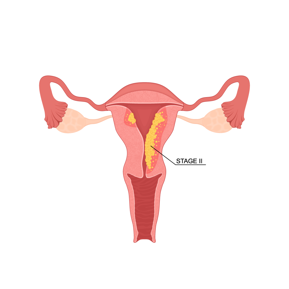 - Stage II (T2, N0, M0): Cancer has spread to the cervical stroma but not beyond the uterus.